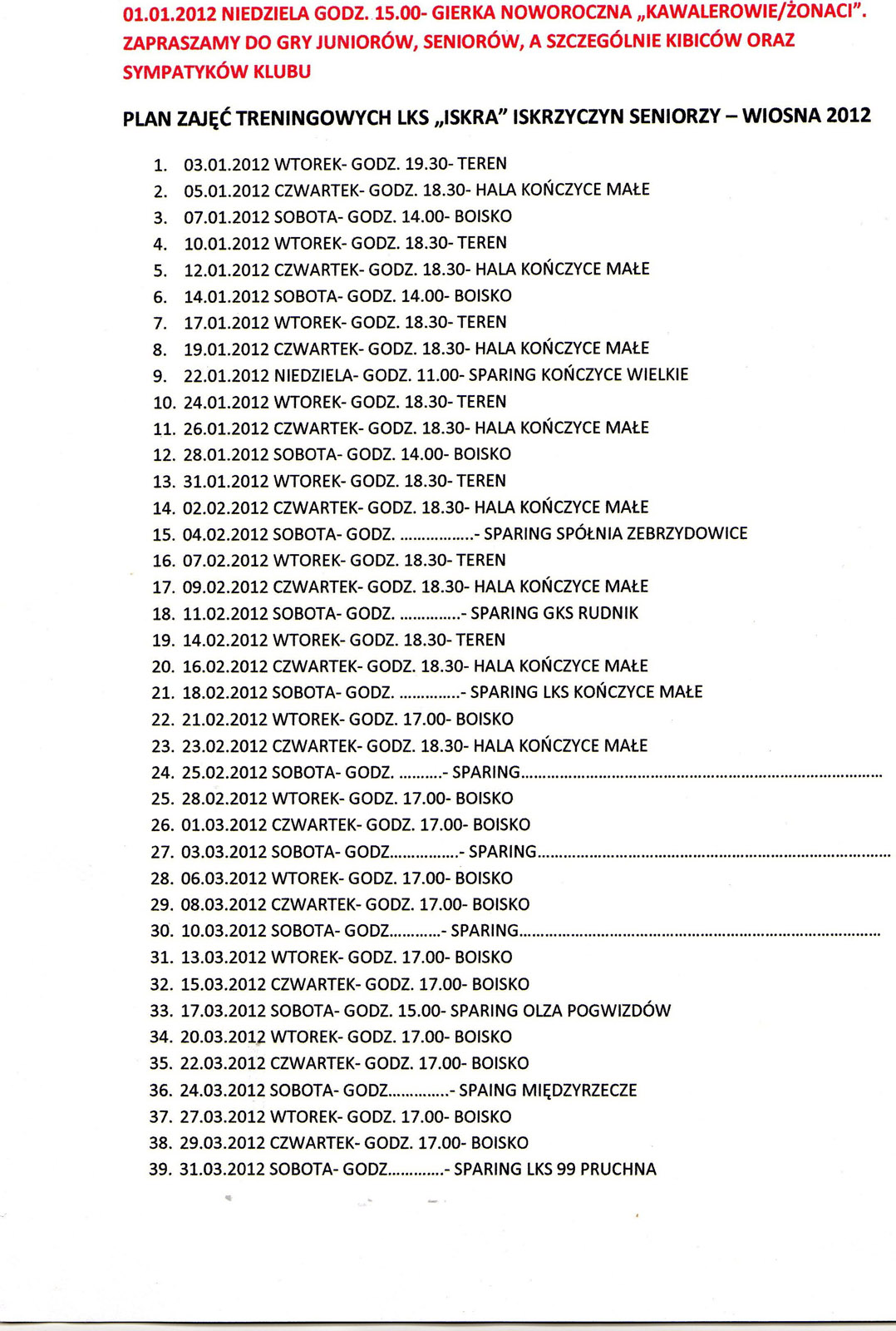 Plan zajęć treningowych SENIORÓW - wiosna 2012